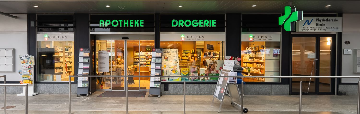 Die Apotheke & Drogerie Ruopigen heisst Sie gerne bei allen Fragen rund um die Themen Gesundheit und Schönheit willkommen. Wir bieten Ihnen ein umfangreiches Sortiment der Schul- und Komplementärmedizin sowie ein vielseitiges Kosmetikangebot.